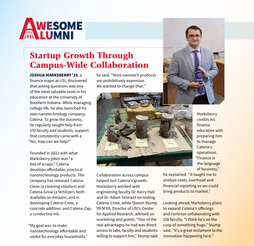 Catena works in collaboration with the University of Southern Indiana’s engineering faculty and the Center for Applied Research on product development and testing.